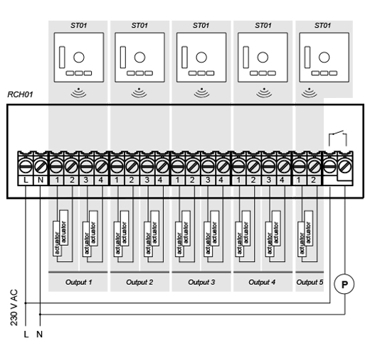 The controller has five electronic outputs for regulating the temperature of five control zones. A maximum of 18 thermo-electrical actuators and one circulation pump can be connected.
